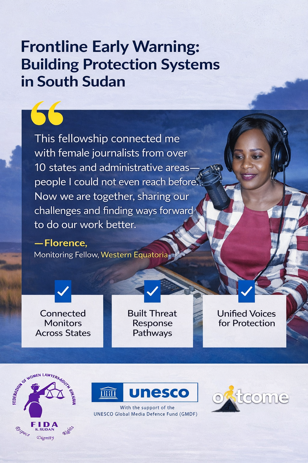 Over the past year, a fellowship has built a human-centered early warning network across South Sudan. For Florence Gume, a monitoring fellow from Western Equatoria, that network is a lifeline—connecting her to female journalists nationwide to detect threats, share strategies, and trigger protection faster. This community-based early warning and protection system connects monitors to detect risks, share strategies, and trigger rapid response together, reports DEBORAH YAR: