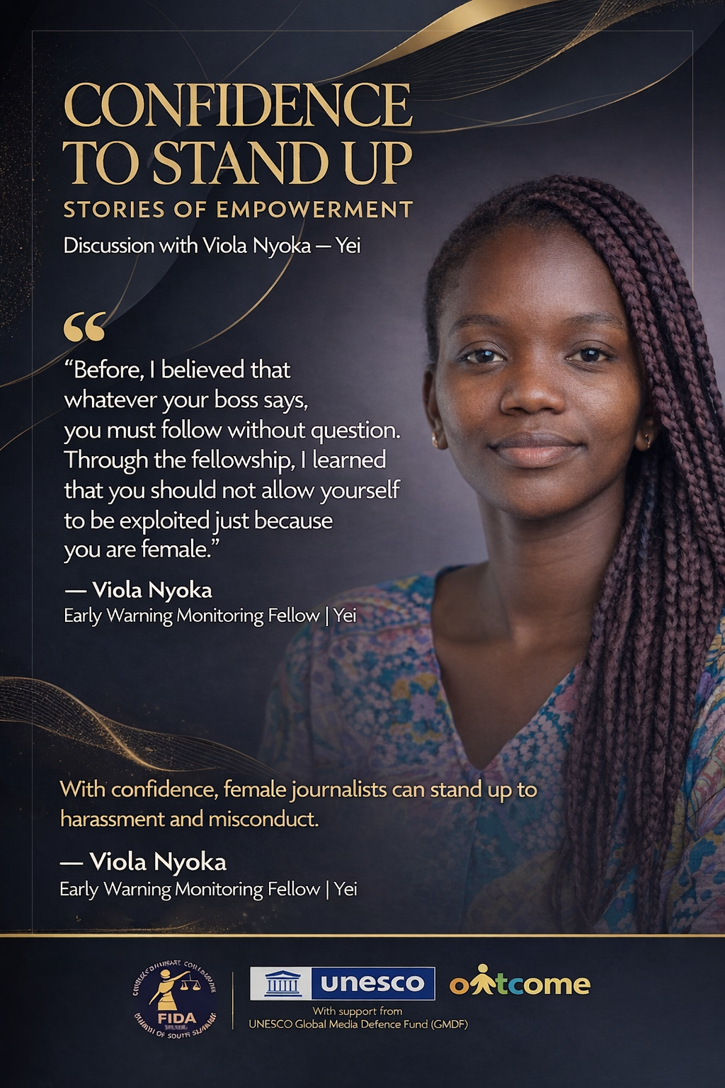 Catherine Adut, an Early Warning Monitoring Fellow from Lakes State, says the fellowship helped her understand her rights and speak up against unfair treatment. Today, she encourages other female journalists to report harassment, defend their rights, and support one another in the newsroom.